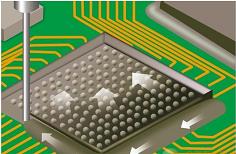 这些关键问题包括:得到完整的和无空洞的芯片底部胶流,在紧密包装的芯片周围分配胶,避免污染其它元件,通过射频外壳或护罩的开口滴胶,控制助焊剂残留物。取得完整和无空洞的胶流,因为填充材料必须通过毛细管作用吸入芯片底部,所以关键是要把针嘴足够靠近芯片的位置,开始胶的流动。